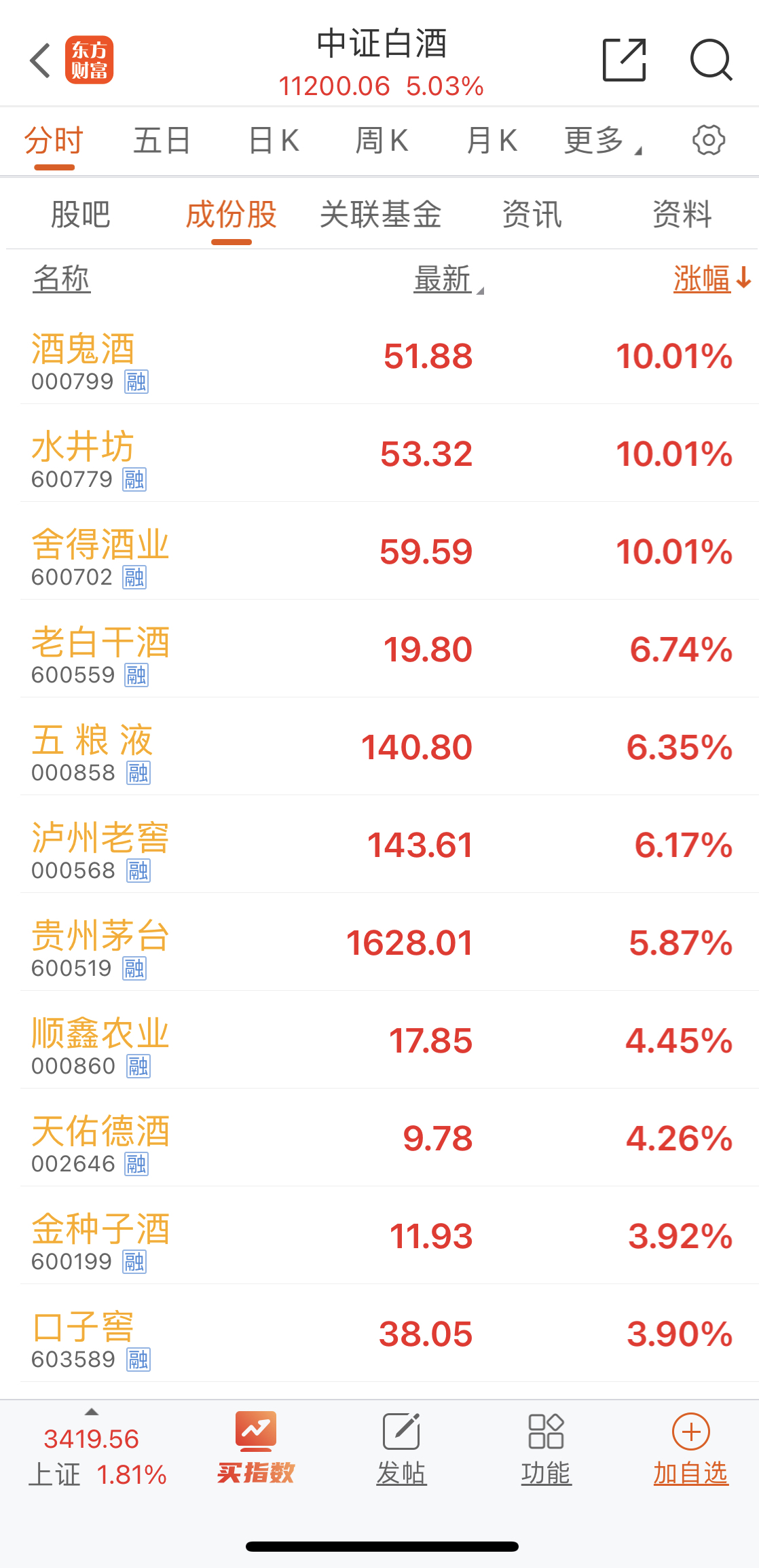 3月14日,白酒股震蕩走高,截至收盤時間,酒鬼酒股份有限公司(簡稱“酒鬼酒”,證券代碼:000799)、舍得酒業股份有限公司(簡稱“舍得酒業”,證券代碼:600702)、四川水井坊股份有限公司(簡稱“水井坊”,證券代碼:600779)漲停,瀘州老窖股份有限公司(簡稱“瀘州老窖”,證券代碼:000568)、宜賓五糧液股份有限公司(簡稱“五糧液”,證券代碼:000858)、貴州茅臺酒股份有限公司(簡稱“貴州茅臺”,證券代碼:600519)漲超5%。
