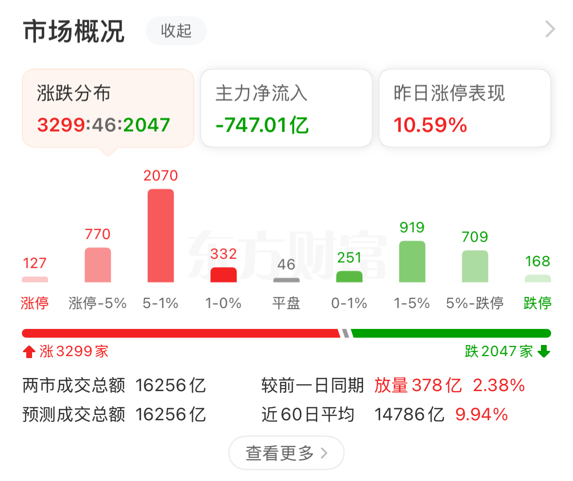 截至下午收盤(pán),三大指數(shù)尾盤(pán)強(qiáng)勢(shì)拉升,滬指收漲1.58%,深證成指收漲0.64%,創(chuàng)業(yè)板指收漲1.83%。滬深兩市成交額超過(guò)1.6萬(wàn)億,較昨日小幅放量。