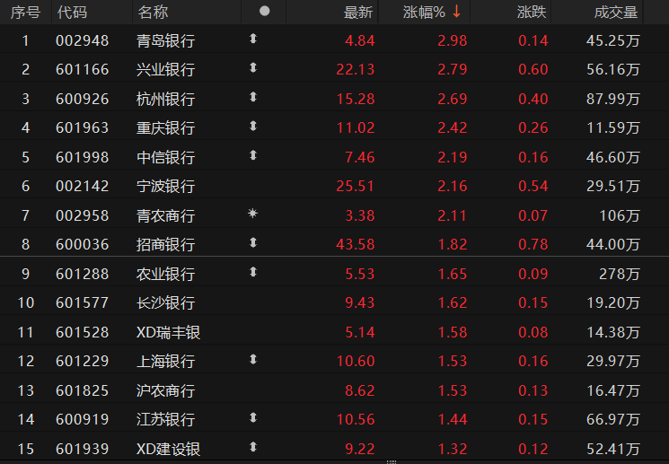 此外,銀行板塊逆勢走高,中國建設銀行股份有限公司(簡稱“建設銀行”)股價再創歷史新高,青島銀行股份有限公司(簡稱“青島銀行”)、重慶銀行股份有限公司(簡稱“重慶銀行”)、興業銀行股份有限公司(以下簡稱“興業銀行”)等多股漲逾2%。