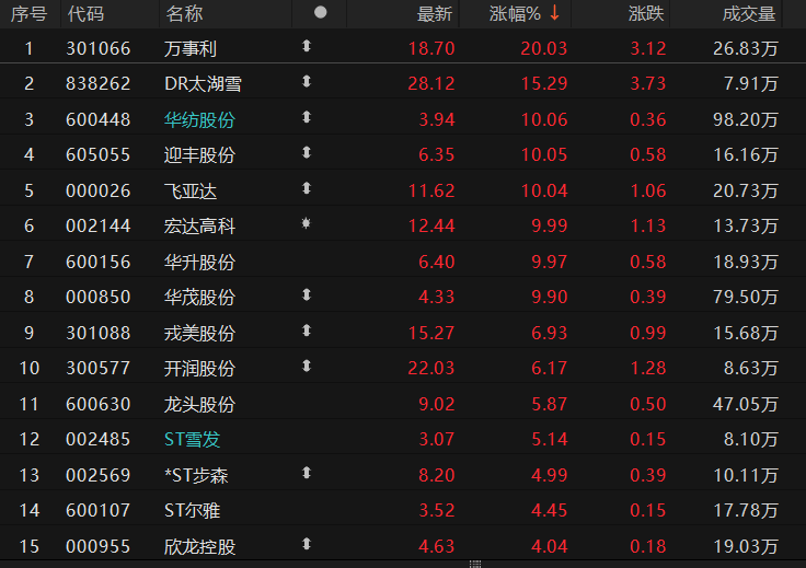 紡織服飾板塊5月9日開盤后表現活躍,個股方面,杭州萬事利絲綢文化股份有限公司(簡稱“萬事利”)實現20cm漲停,華紡股份有限公司(以下簡稱“華紡股份”)走出四連板,浙江迎豐科技股份有限公司(簡稱“迎豐股份”)、飛亞達精密科技股份有限公司(簡稱“飛亞達”)、安徽華茂紡織股份有限公司(簡稱“華茂股份”)等多股漲停。