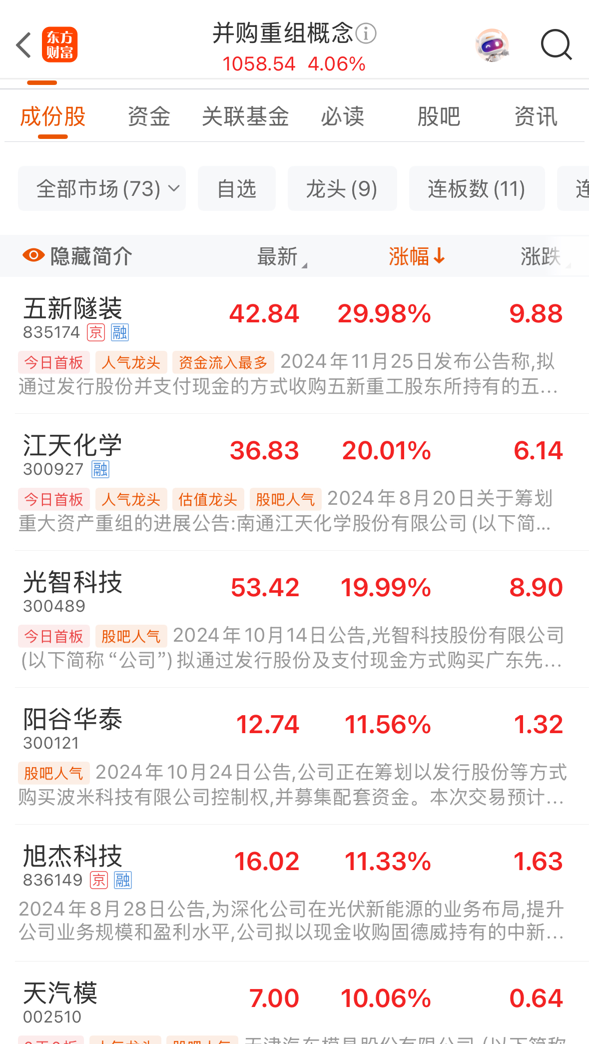 具體來看,并購重組概念板塊成分股中,北交所上市公司五新隧裝(835174)以“30CM”幅度收漲停;江天化學(300927)、光智科技(300489)“20CM”漲停;天汽模(002510)、本鋼板材(000761)、四川雙馬(000935)等個股“10CM”漲停;此外新巨豐(301296)、陽谷華泰(300121)個股紛紛跟漲。
