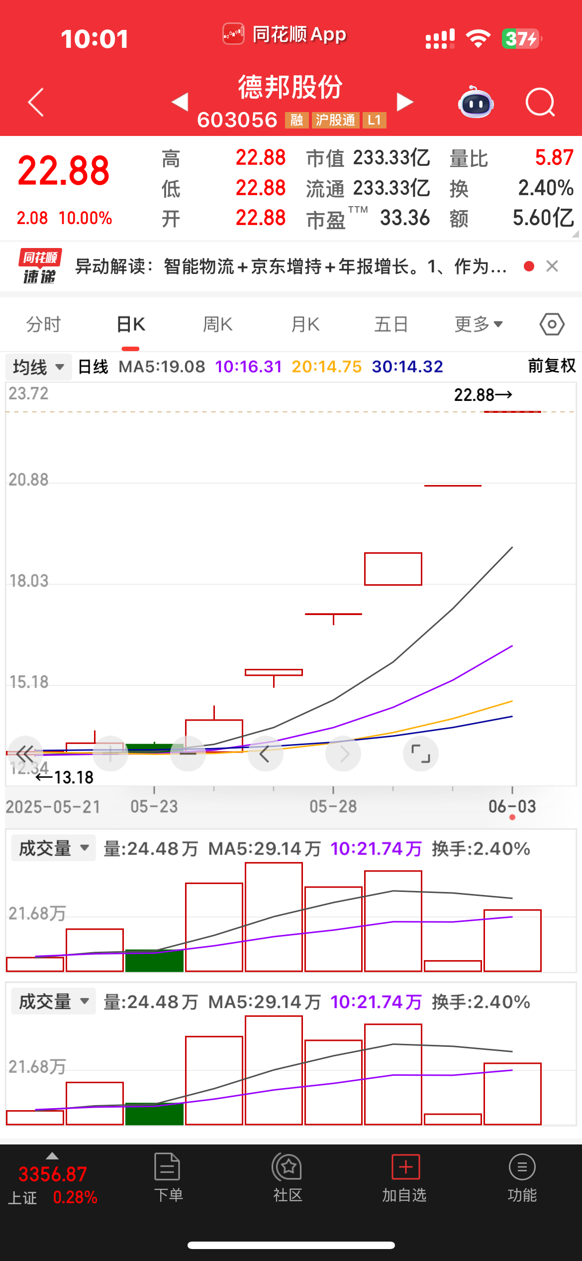 6月3日,德邦股份(股票代碼:603056)早盤漲停,實現五連板。截至記者發稿,公司股價封于22.88元/股,總市值達233.33億元。