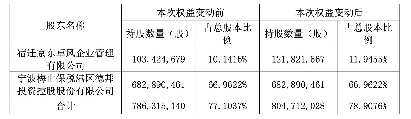 德邦股份公告顯示,4月28日至5月7日期間,宿遷京東卓風企業管理有限公司(以下簡稱“京東卓風”)通過集中競價交易方式、大宗交易方式增持公司股份共18396888股,占公司目前總股本的比例為1.8039%。本次權益變動后,京東卓風直接持有公司股份121821567股,約占公司總股本的11.9455%,德邦控股及京東卓風合計持有公司股份804712028股,約占公司總股本的78.9076%。