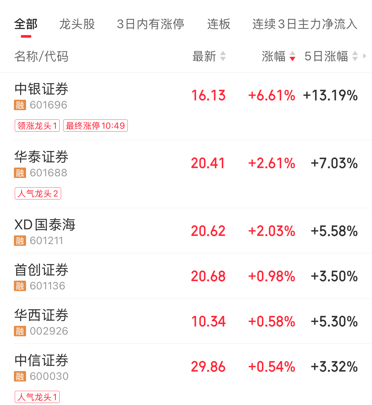 同花順數(shù)據(jù)顯示,截至午間收盤,證券板塊沖高回落,板塊成交額達(dá)440億元,板塊內(nèi)19只個(gè)股上漲。其中,領(lǐng)漲龍頭——中銀證券,盤中表現(xiàn)尤為搶眼,一度觸及漲停板,該股月內(nèi)累計(jì)漲幅已超過50%,成為市場焦點(diǎn)。華泰證券、國泰海通、首創(chuàng)證券紛紛跟漲。