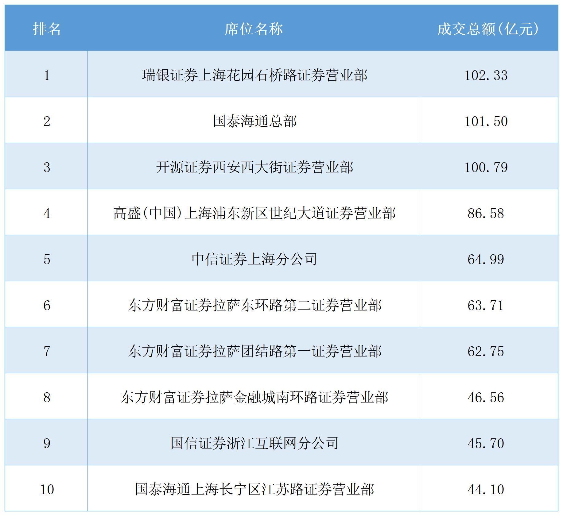 此外,躋身券商龍虎榜前十名的營業部還包括中信證券上海分公司、東方財富證券拉薩東環路第二證券營業部、東方財富證券拉薩團結路第一證券營業部、東方財富證券拉薩金融城南環路證券營業部、國信證券浙江互聯網分公司、國泰海通上海長寧區江蘇路證券營業部,依次為第五名至第十名。