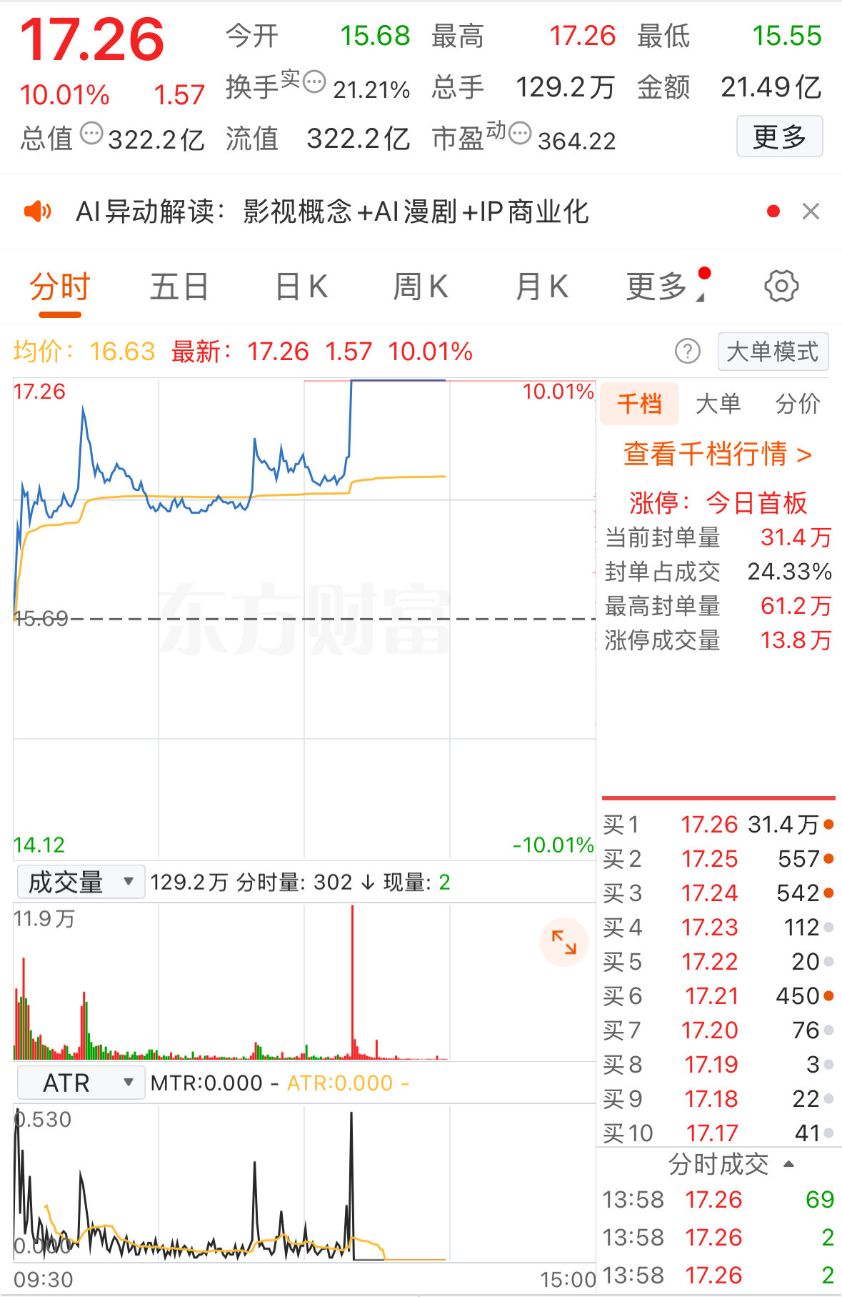 11月5日午后,A股市場(chǎng)影視院線板塊短線拉升,13時(shí)20分中國(guó)電影直奔漲停,截至記者發(fā)稿時(shí),中國(guó)電影買一封單超30萬手。