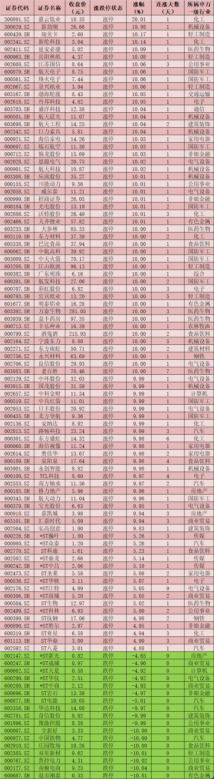 板塊方面,申萬一級28個行業中,僅傳媒行業指數微跌0.29%,其他27個申萬一級行業均實現不同程度的上漲,非銀金融行業指數漲幅居首,達5.82%,休閑服務行業指數漲幅也在5%以上,達到5.05%,此外,國防軍工、家用電器、機械設備等行業指數漲幅也均在3%以上。