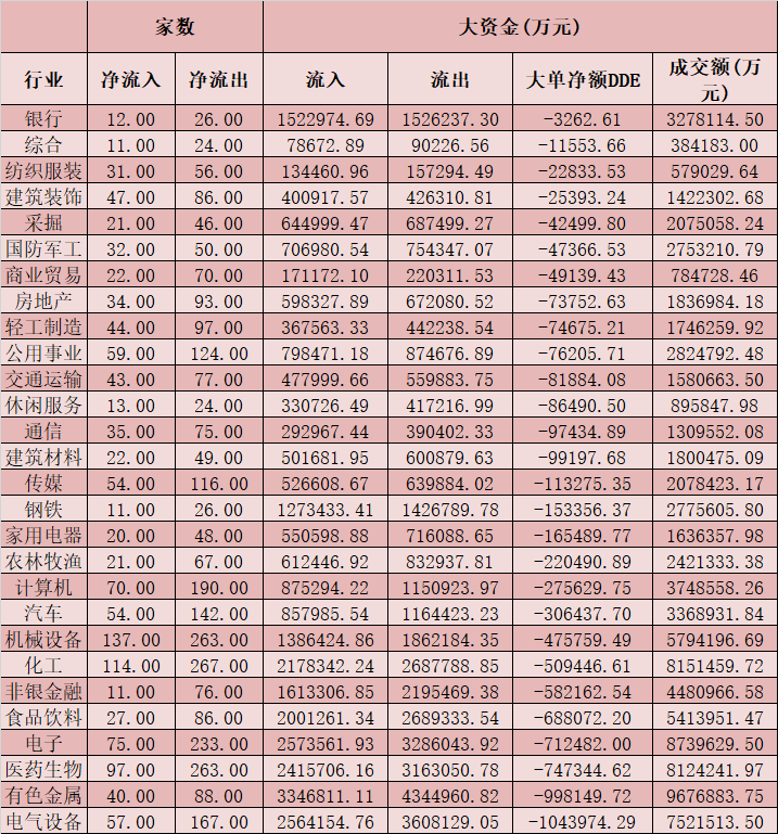 二、周四(3月4日)申萬一級行業(yè)大單資金流向