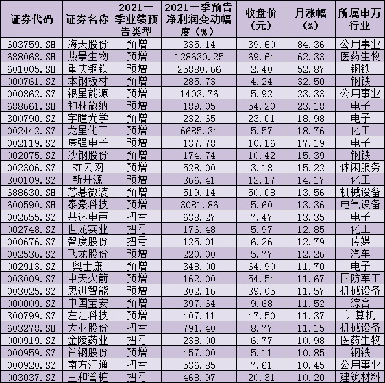 表:月內累計漲幅超10%的一季報有望翻番個股情況: