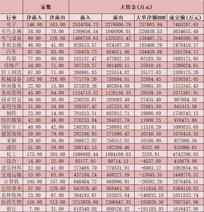 從資金層面看,周三,A股大單資金整體凈流入50.17億元,其中,有1828只個股呈現資金凈流入,2298只個股呈現資金凈流出。在申萬一級的28個行業中,有20個行業實現大單資金凈流入,其中,電子、有色金屬、電氣設備、非銀金融、汽車等五大行業大單資金凈流入金額均在10億元以上,另外,銀行、醫藥生物、農林牧漁、公用事業等四大行業大單資金凈流出均超10億元。