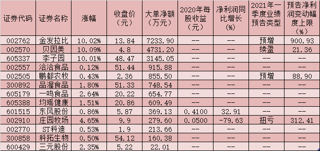 表:4月15日實現大單資金凈流入的乳業概念股一覽