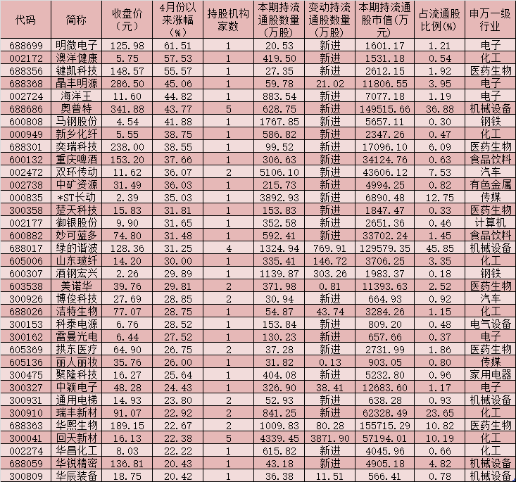 QFII重倉股4月份以來股價表現同樣可圈可點,有160只個股期間股價實現上漲,占比逾五成。其中,明微電子、澳洋健康、鍵凱科技、晶豐明源、海洋王、奧普特、馬鋼股份等7只個股期間累計漲幅均超40%。