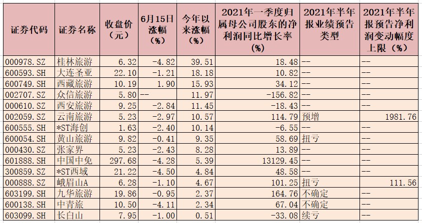 與此同時(shí),旅游板塊公司的業(yè)績(jī)也在恢復(fù)向好,同花順數(shù)據(jù)顯示,有19家景點(diǎn)及旅游公司今年一季度歸屬母公司股東的凈利潤實(shí)現(xiàn)同比增長(zhǎng),占比超七成,其中,中國中免、宋城演藝、九華旅游、云南旅游、峨眉山A等5家公司今年一季度歸屬母公司股東的凈利潤同比增長(zhǎng)率均超100%。此外,截至6月15日收盤,有9家景點(diǎn)及旅游公司發(fā)布了今年上半年業(yè)績(jī)預(yù)告,有3家公司業(yè)績(jī)預(yù)喜,其中,云南旅游業(yè)績(jī)預(yù)增,峨眉山A和黃山旅游預(yù)計(jì)扭虧。