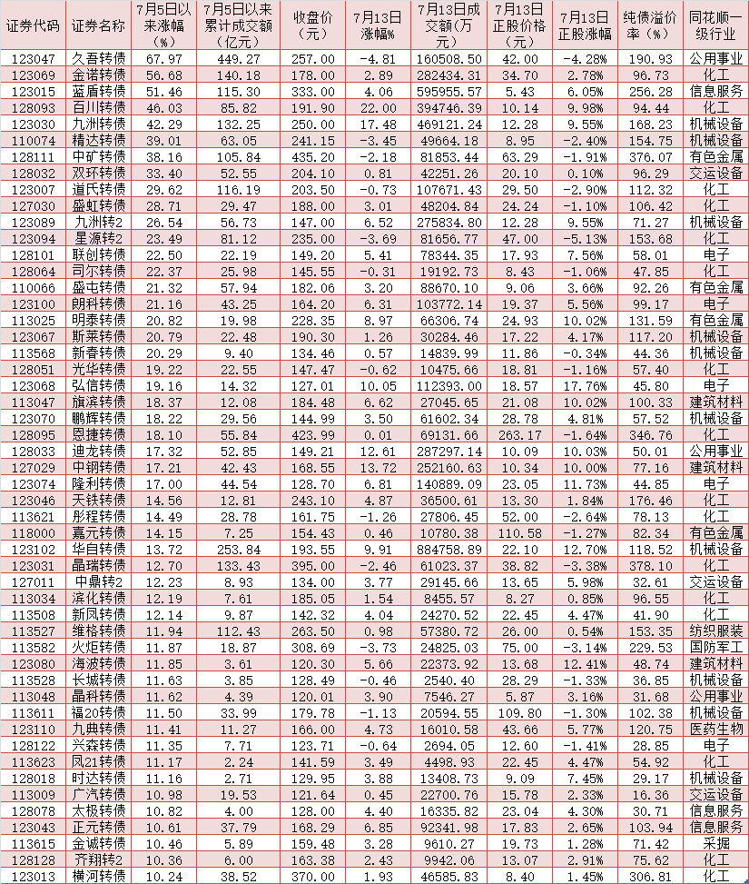 表:7月5日以來(lái)累計(jì)漲幅超10%的可轉(zhuǎn)債一覽
