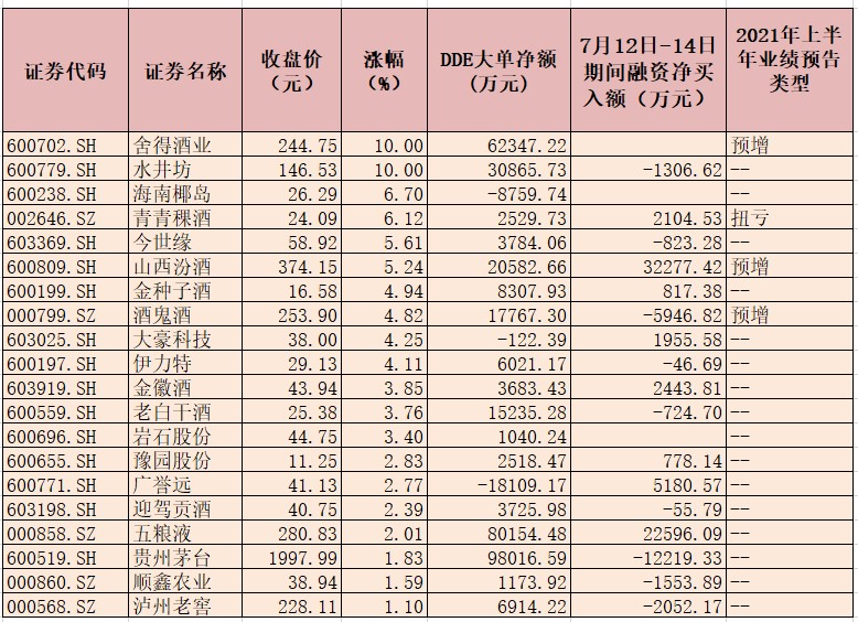 近期白酒概念股也獲得融資客的青睞。7月12日-14日期間,共有15只白酒股獲融資客加倉,其中,期間融資凈買入額居首的是山西汾酒,為3.23億元,其次是五糧液和白云山,期間融資凈買入額分別為2.26億元、1.63億元。