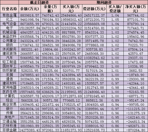 從行業分布來看,7月份以來,在28個申萬一級行業中,14個行業獲融資凈買入。其中,有色金屬、化工、電氣設備、電子等四行業,融資凈買入額均超70億元,分別為96.78億元、87.71億元、87.68億元和71.74億元。由此計算,上述四行業融資客合計凈買入額達343.91億元。緊隨其后的是機械設備、食品飲料等兩行業,融資凈買入額均超10億元。