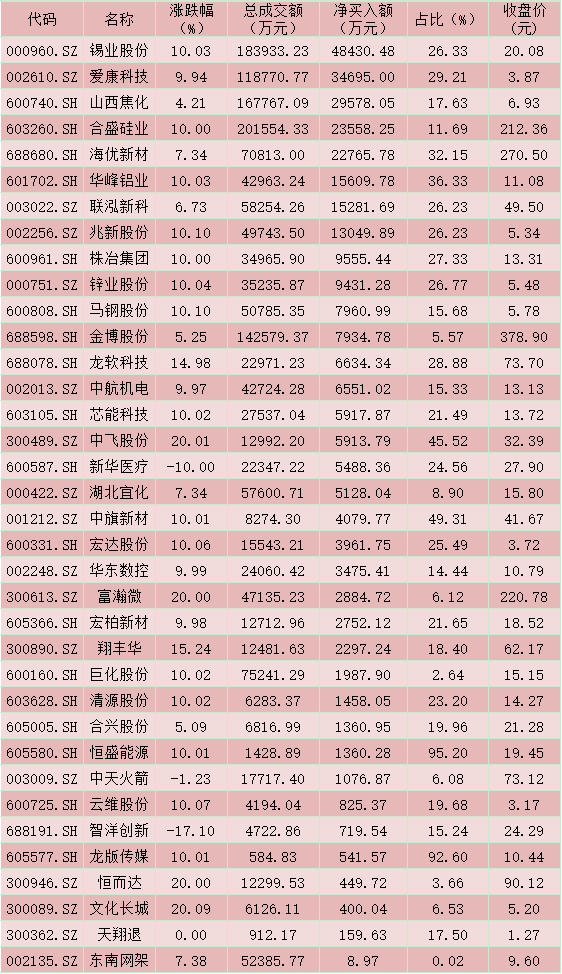 有36只個股受到前十大營業(yè)部搶籌,其中,錫業(yè)股份(48430.48萬元)、愛康科技(34695.00萬元)、山西焦化(29578.05萬元)、合盛硅業(yè)(23558.25萬元)、海優(yōu)新材(22765.78萬元)等5只個股凈買入額過2億元。