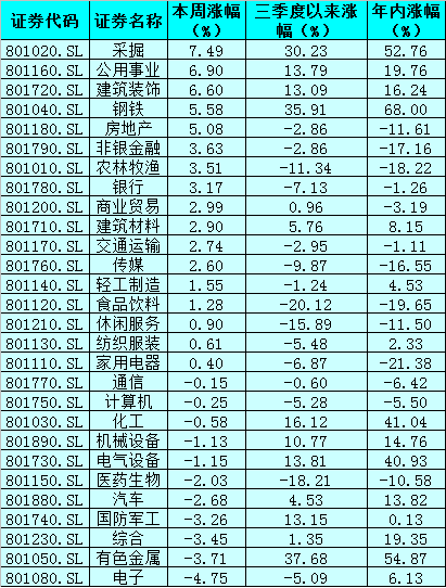 從申萬一級28個行業(yè)來看,上周有17個行業(yè)實現(xiàn)上漲,其中,采掘、公用事業(yè)、建筑裝飾、鋼鐵、房地產(chǎn)等行業(yè)指數(shù)周漲幅均超5%。另外,電子行業(yè)指數(shù)周跌幅居首,周跌幅達到4.75%。