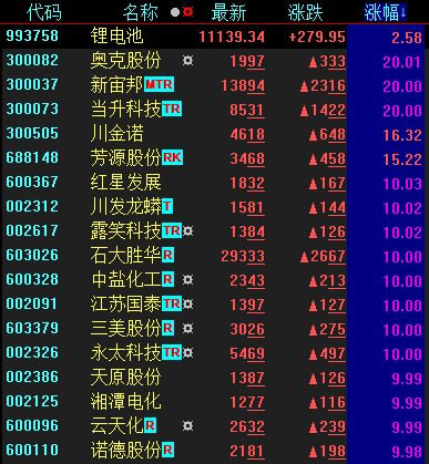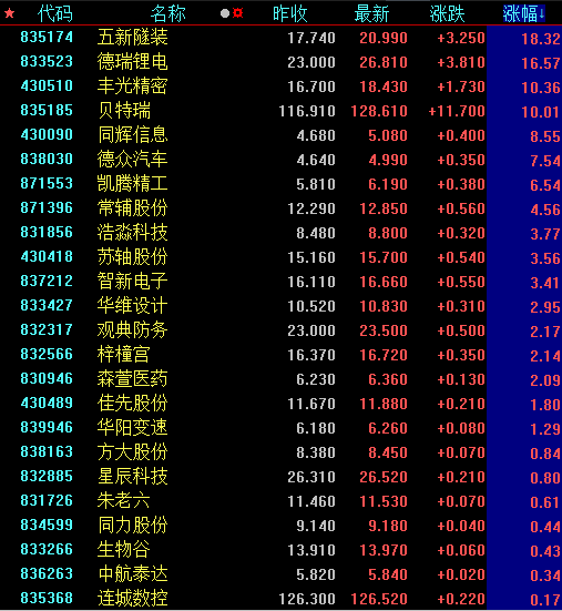 值得關注的是,新三板精選層延續強勢,24只個股飄紅。五新隧裝、德瑞鋰電、豐光精密、貝特瑞等個股漲幅均在10%以上。其中,五新隧裝9月份以來漲幅達到143.79%。