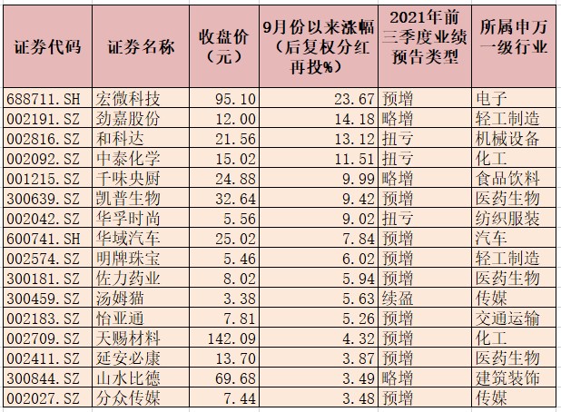 表:9月份以來漲幅超3%的業績預喜股一覽
