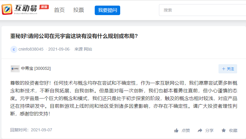昨日,中青寶對投資者在互動平臺上的問題“請問公司在元宇宙這塊有沒有什么規劃或布局?”作出回應。