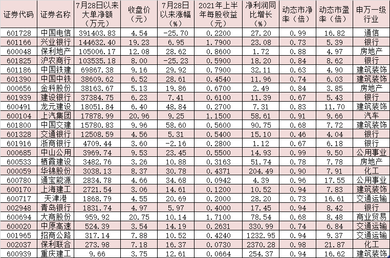 表:7月28日以來(lái)獲大單資金追捧的破凈股一覽