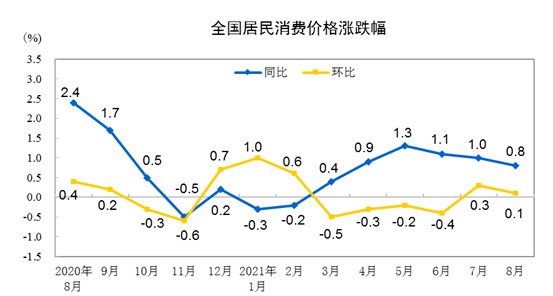 從環比看,CPI上漲0.1%,漲幅比上月回落0.2個百分點。從同比看,CPI上漲0.8%,漲幅比上月回落0.2個百分點。