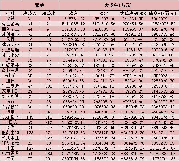 資金流向方面,周四,滬深兩市大單資金凈流出380.97億元,從申萬一級行業來看,僅7個行業呈現資金流入態勢,鋼鐵和有色金屬等兩行業大單資金凈流入均在20億元以上。