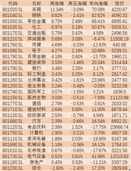 從申萬一級28個行業來看,上周有27個行業實現上漲,其中,采掘、鋼鐵、有色金屬、化工、交通運輸、休閑服務等行業指數周漲幅均超5%,僅有綜合行業周下跌1.80%。
