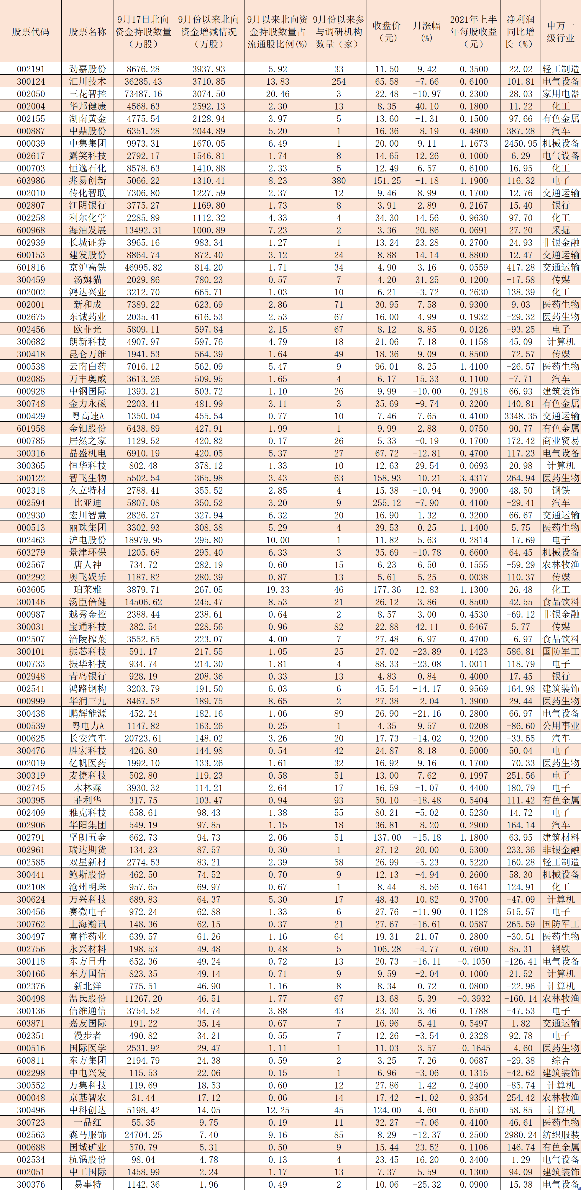 表:9月份以來獲機(jī)構(gòu)調(diào)研且被北向資金增持的個(gè)股一覽