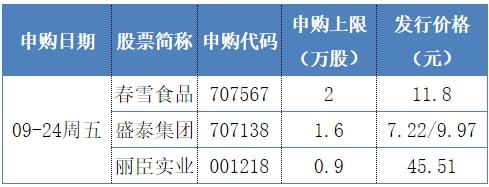 根據新股發行安排,9月24日(周五)將有主板3家企業開啟申購,分別為湖南的麗臣實業(001218)、浙江的盛泰集團(605138)和山東的春雪食品(605567)。其中,表面活性劑廠商麗臣實業具有“肉簽”潛質。