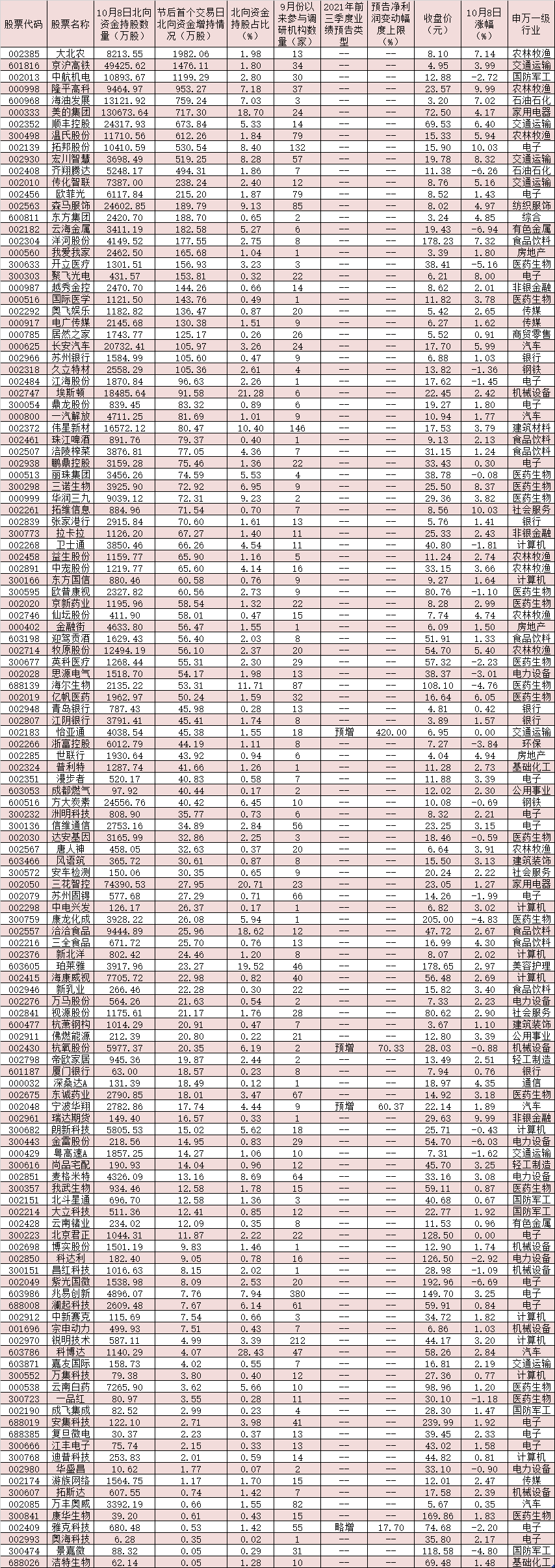 值得一提的是,節后首個交易日北向資金也紛紛涌入部分機構調研品種進行搶籌。統計顯示,上述674只個股中,截至目前,有345只個股獲北向資金持倉,其中,有130只個股首個交易日被北向資金增持,大北農、京滬高鐵、中航機電等3只個股節后首個交易日北向資金增持數量均超1000萬股,分別為1982.06萬股、1476.11萬股和1199.29萬股,隆平高科、海油發展、美的集團、順豐控股、溫氏股份、拓邦股份、宏川智慧等7只個股節后首個交易日北向資金增持數量均在500萬股以上。