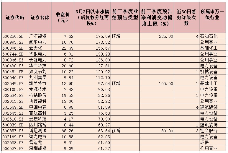 表:3月2日以來漲幅超61%的碳中和概念股一覽