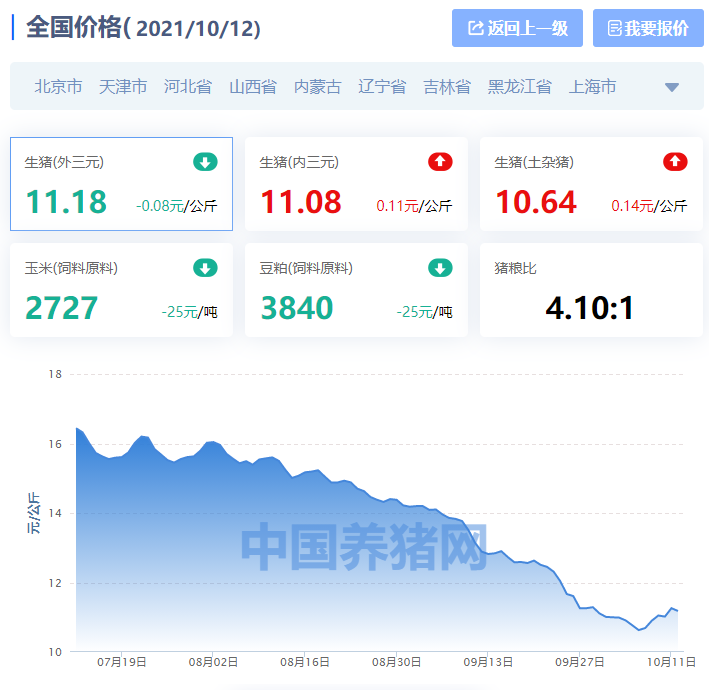 其次,生豬現(xiàn)貨市場行情已有好轉(zhuǎn)跡象。10月12日,中國養(yǎng)豬網(wǎng)養(yǎng)豬數(shù)據(jù)中心數(shù)據(jù)顯示:生豬(外三元)均價為11.18元/公斤,價格較10月6日上漲了0.55元/公斤;生豬(內(nèi)三元)價格為11.08元/公斤,價格較前10月6日上漲了0.69元/公斤;生豬(土雜豬)價格為10.64元/公斤,較10月6日上漲0.64元/公斤。“節(jié)后以來,國內(nèi)生豬現(xiàn)貨價格有抬頭跡象,多數(shù)地區(qū)豬價普遍上漲。當前國內(nèi)部分地區(qū)交通運輸出現(xiàn)困難,加上大體重豬源消耗充分均導致現(xiàn)貨逐步好轉(zhuǎn)。”陳界正表示。