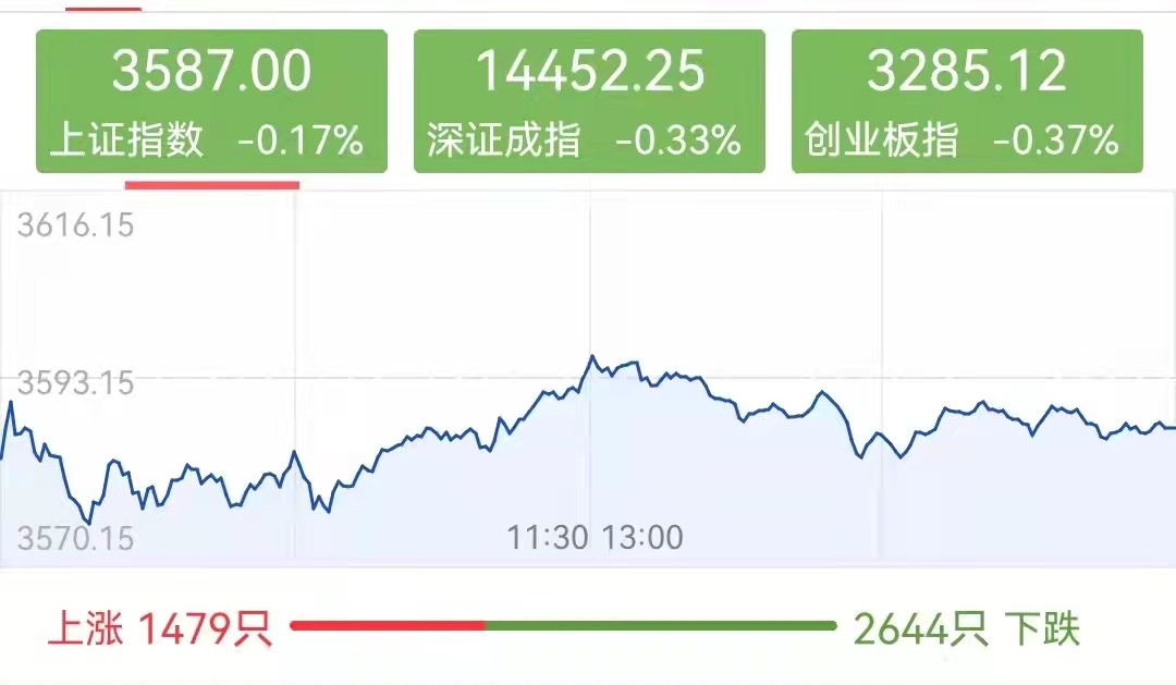 震蕩徘徊,成為周三A股市場(chǎng)走勢(shì)的主要特征。周三,三大指數(shù)震蕩走弱,截至收盤(pán),上證指數(shù)微跌0.17%,報(bào)3587點(diǎn),深證成指跌0.33%,報(bào)14452.25點(diǎn),創(chuàng)業(yè)板指跌0.37%,報(bào)3285.12點(diǎn);兩市合計(jì)成交額達(dá)10202億元,成交額突破1萬(wàn)億元關(guān)口。北向資金凈買(mǎi)入40.79億元;總體來(lái)看,兩市個(gè)股跌多漲少。