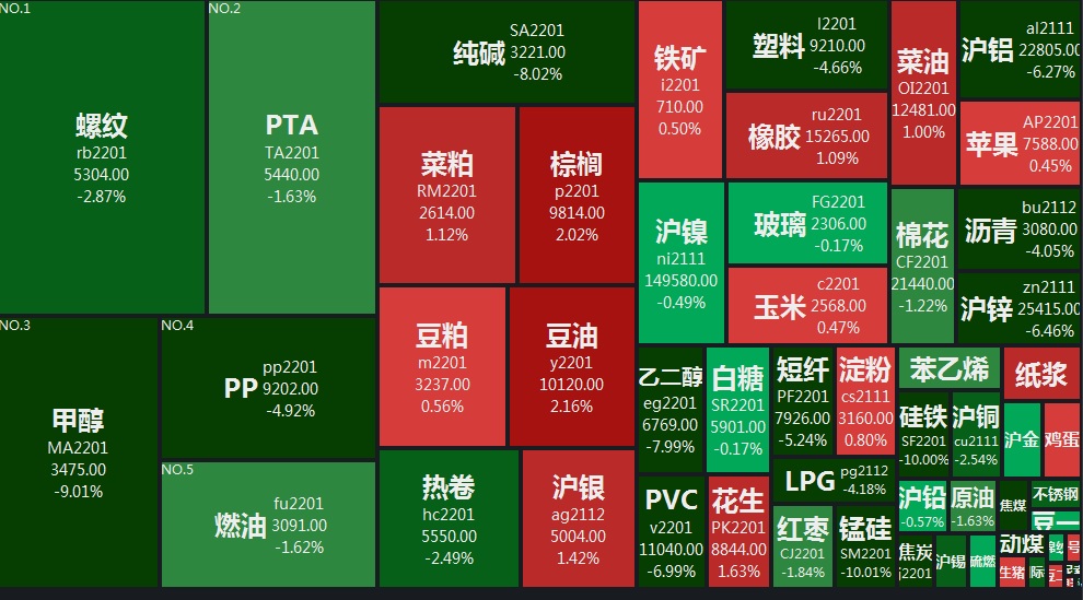 國(guó)內(nèi)商品期貨多數(shù)收跌,錳硅、硅鐵、甲醇、焦煤、焦炭、尿素、純堿、動(dòng)力煤、乙二醇、PVC跌停,滬鋅、滬鋁跌逾6%,短纖跌逾5%,塑料、PP、瀝青LPG跌超4%,滬銅、螺紋、熱卷跌超2%。