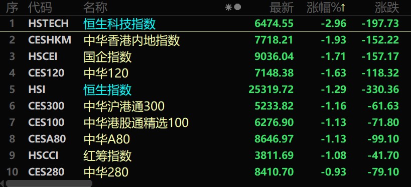 經(jīng)過(guò)近期的震蕩反彈后,11月18日,港股市場(chǎng)再度面臨大幅調(diào)整,恒生科技指數(shù)盤(pán)中一度跌超3%,截至收盤(pán),港股主要指數(shù)普遍下跌,恒生科技指數(shù)跌2.96%,報(bào)6474.55點(diǎn);恒生指數(shù)跌1.29%,報(bào)25319.72點(diǎn)。