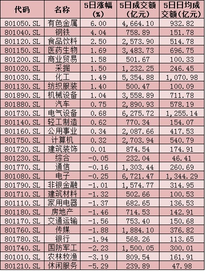 從申萬一級(jí)行業(yè)來看,本周有15個(gè)行業(yè)實(shí)現(xiàn)上漲,其中,有色金屬(6.00%)、鋼鐵(4.04%)、食品飲料(2.5%)等行業(yè)指數(shù)。累計(jì)周漲幅均超2%。另外,休閑服務(wù)、農(nóng)林牧漁、國(guó)防軍工