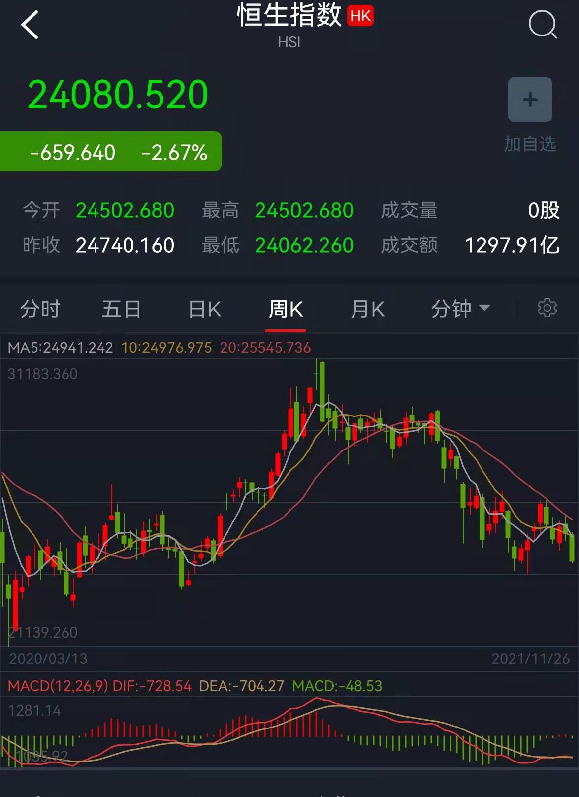 周五,香港股市出現(xiàn)單邊下挫,恒生指數(shù)收盤跌2.67%,報(bào)24080.52點(diǎn),創(chuàng)逾一個(gè)半月低位,本周累計(jì)下跌3.87%;恒生科技指數(shù)跌3.25%,本周累計(jì)下跌4.74%。