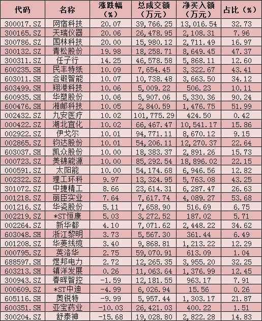值得關注的是,網宿科技、天瑞儀器、國林科技等3只個股,周三均報收于“20厘米”漲停,勇登龍虎榜。