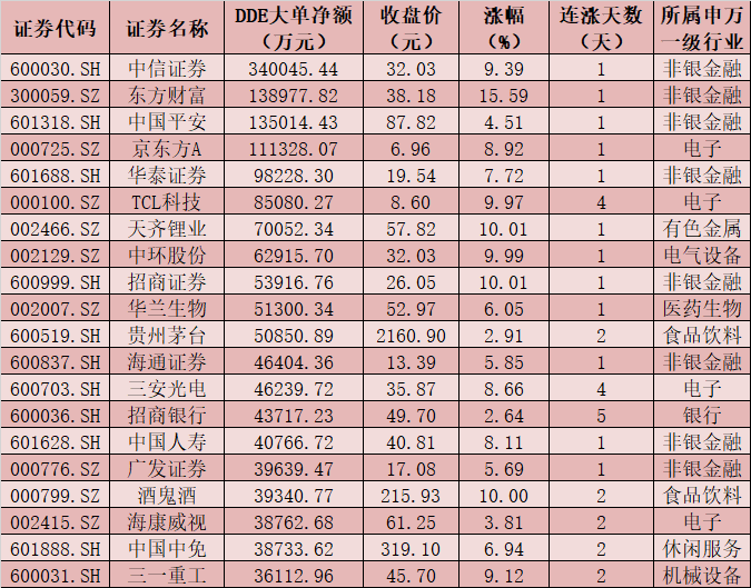 周二券商板塊有42只個股累計呈DDE大單主動凈流入態勢,其中,中信證券(34.00億元)、東方財富(13.90億元)、華泰證券(9.82億元)、招商證券(5.39億元)、海通證券(4.64億元)、廣發證券(3.96億元)、國泰君安(2.75億元)、興業證券(2.55億元)、中金公司(2.47億元)等9只個股DDE大單凈買入額均超2億元,合計79.49億元...>>詳情