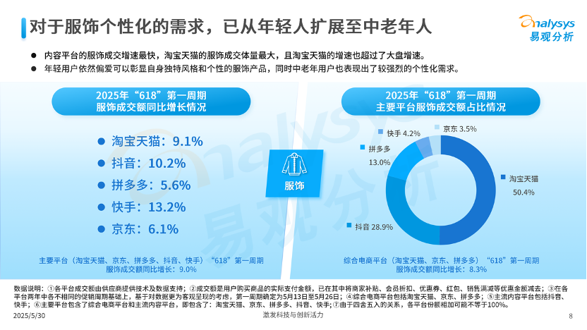 易觀分析數(shù)據(jù)顯示,“618”第一階段的銷售中,淘寶天貓服飾成交額在全平臺(tái)的占比達(dá)50.4%,抖音占據(jù)28.9%,京東占據(jù)3.5%,淘寶天貓的體量最大,優(yōu)勢(shì)明顯。