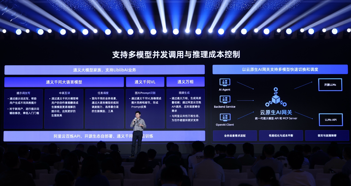 在社區層面,LiblibAI通過接入通義系列模型實現多模型并發調用與推理成本控制。在提示詞環節,針對圖像風格和中英語言問題,通義千問可對用戶提示詞進行改寫,并翻譯成圖像模型能夠理解的描述。此外,用戶還可提供參考圖片,通過通義千問VL進行識別,更準確地描述想要生成的圖片風格和細節。在模型選擇上,通義千問可根據用戶需求對模型進行規劃調度,同時阿里云云原生AI網關支持多模型的快速切換,幫助控制推理成本。在生成環節,高峰期間用戶可直接調用百煉平臺API來使用通義萬相模型,生成10秒以上的視頻。