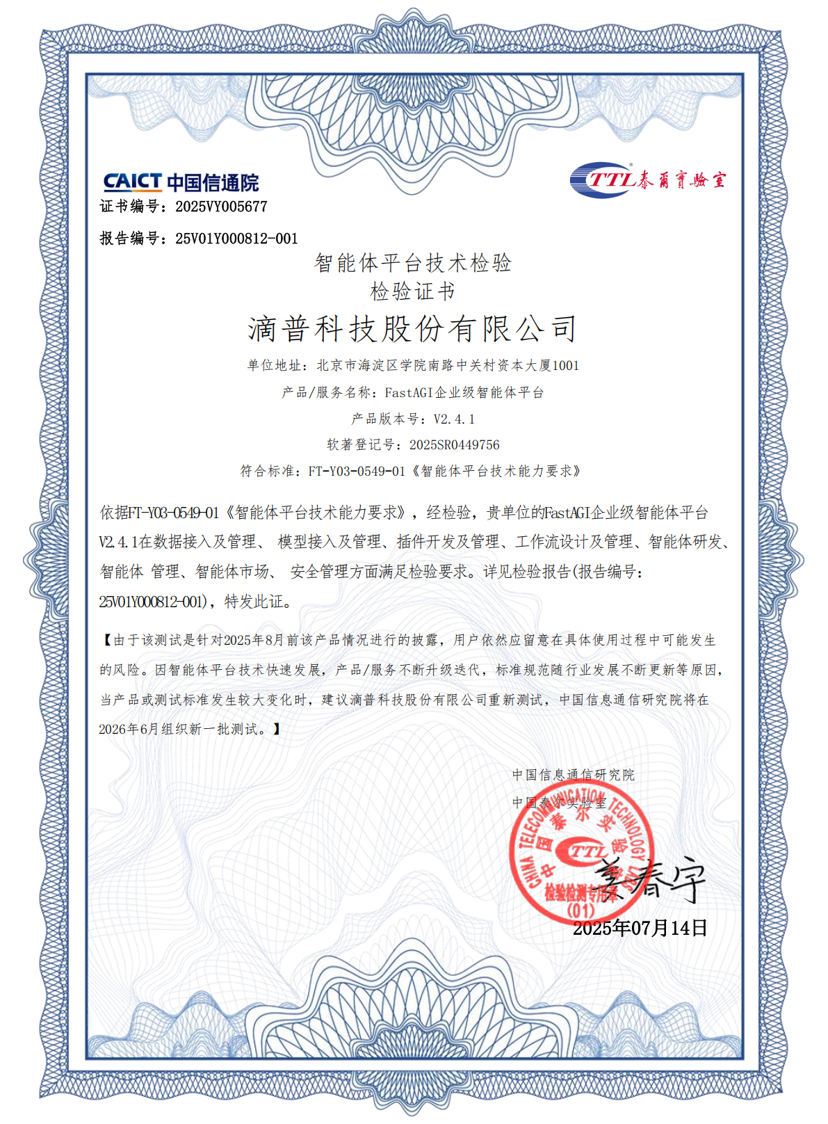 本報(bào)訊 (記者袁傳璽)近期,滴普科技股份有限公司(以下簡(jiǎn)稱“滴普科技”)旗下FastAGI企業(yè)級(jí)智能體平臺(tái)通過(guò)了中國(guó)信通院智能體平臺(tái)能力專項(xiàng)測(cè)試,成為首批通過(guò)該測(cè)試的平臺(tái)之一。