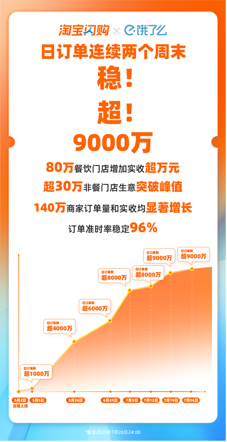本報訊 (記者梁傲男)7月28日,淘寶閃購和餓了么聯合宣布,連續兩個周末的日訂單(7月19日及7月26日)超過9000萬(不含0元購及自提)。此前的7月14日,淘寶閃購已宣布日訂單峰值連續兩周超8000萬,訂單量呈穩定且持續提升突破勢頭。