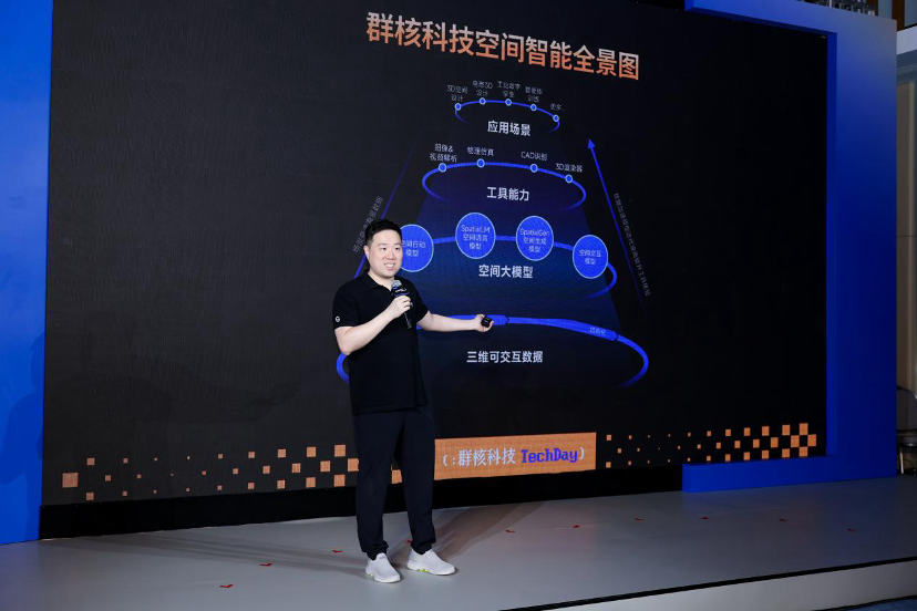 活動現場,黃曉煌分享了群核科技在空間智能布局上的最新思考?;诳峒覙愤@一全球最大的空間設計平臺,群核科技構建了“空間編輯工具-空間合成數據-空間大模型”的空間智能飛輪,讓工具沉淀數據,用數據加速模型訓練,用模型提升工具體驗,再在工具的廣泛應用中沉淀更為豐富的場景數據。資料顯示,截至6月30日,群核科技擁有包含超過4.41億個3D模型及超過5億個結構化3D空間場景。