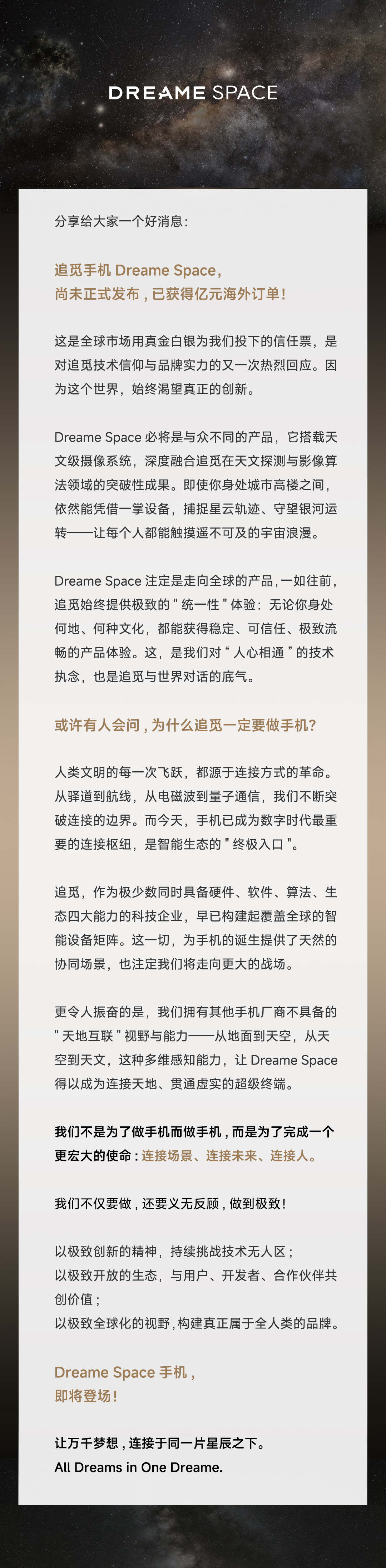 Dreame Space定位高端旗艦,在保障高端綜合體驗的同時還帶來了“天文攝影”這一區別同類產品的核心賣點,踐行追覓的創新理念,以此試圖重新定義智能旗艦手機的標準。