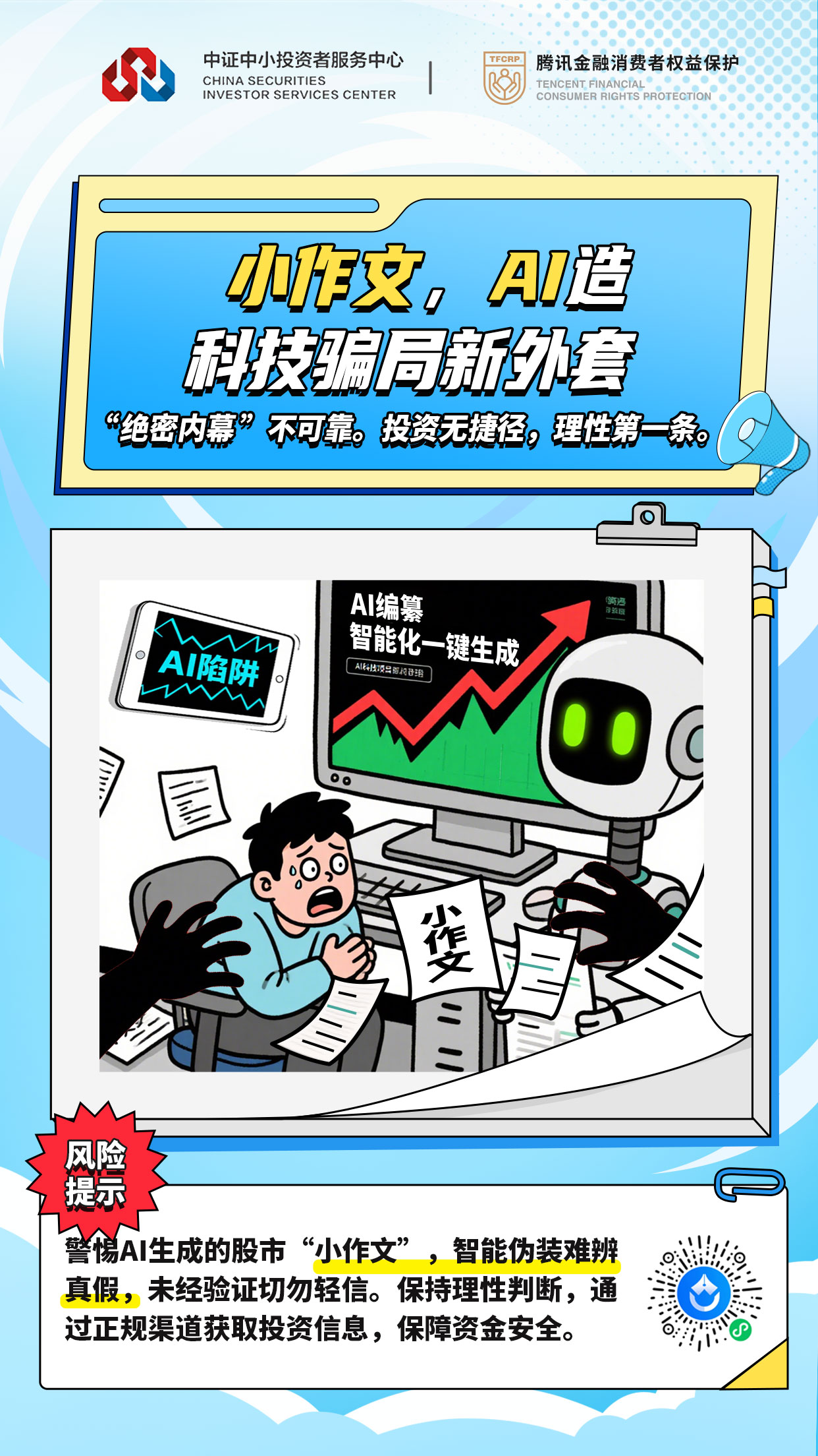 今天,中證投服中心提醒您:小作文,AI造,科技騙局新外套,“絕密內幕”不可靠。投資無捷徑,理性第一條。