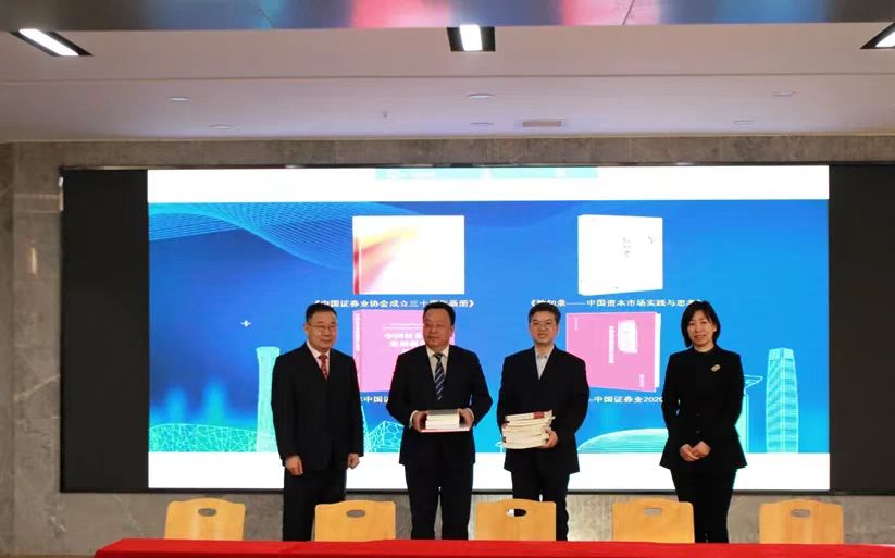 簽約儀式后,安青松書記代表中國證券業協會、時建中副校長代表中國政法大學雙方互贈圖書。