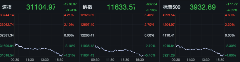 數據發布后,受情緒影響,美元指數短線快速拉升,再次站上109關口。美股三大指數則出現暴跌,創下2020年6月份以來最大單日跌幅。道指跌1276.37點,跌幅3.94%;納指跌632.84點,跌幅5.16%;標普500指數跌177.72點,跌幅4.32%。美債、黃金等資產也出現全線下挫。